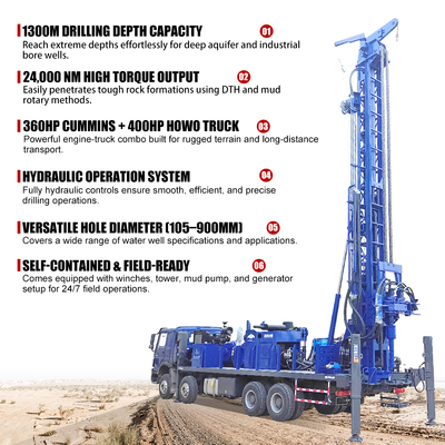 با استفاده از یک موتور دیزل 360HP کامینز بر روی یک شاسی قوی 8x4 SINOTRUCK HOWO نصب شده است ، CSD1300 به طور خاص برای نواحی چالش برانگیز و دوام طولانی ساخته شده است.از روستاهای دور افتاده به مناطق ساختمانی صنعتی، این دستگاه هر مکان را به یک ایستگاه حفاری کاملا مجهز و مستقل تبدیل می کند - با مجموعه ژنراتور، برج کنترل هیدرولیکی، وینچ ها و یک پمپ گل فشار بالا BW1500/12