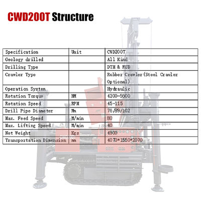CWD200T Crawler Mounted Rotary Water Well Drill Rig برای عملیات حفاری متنوع در تشکیلات مختلف زمین شناسی طراحی شده است.از حفاری لجن برای تشکیلات نرم و چکش هوا DTH برای حفاری سنگ استفاده می کند، با فشار هوا برای تخلیه slag، ارائه بهره وری به طور قابل توجهی بالاتر از حفاری روتاری سنتی.
